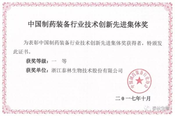 泰林生物榮獲“中國制藥裝備行業技術創新先進集體一等獎”