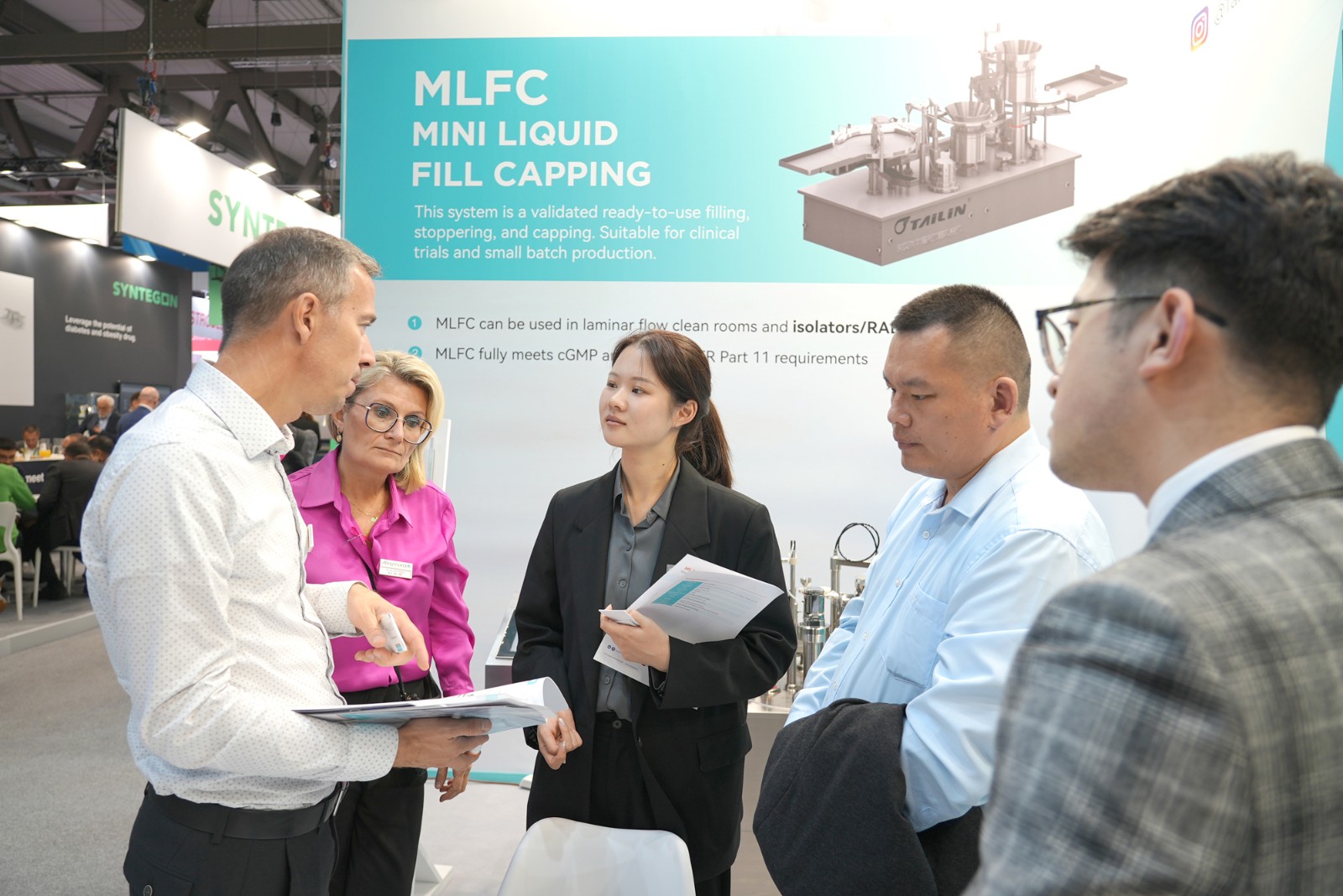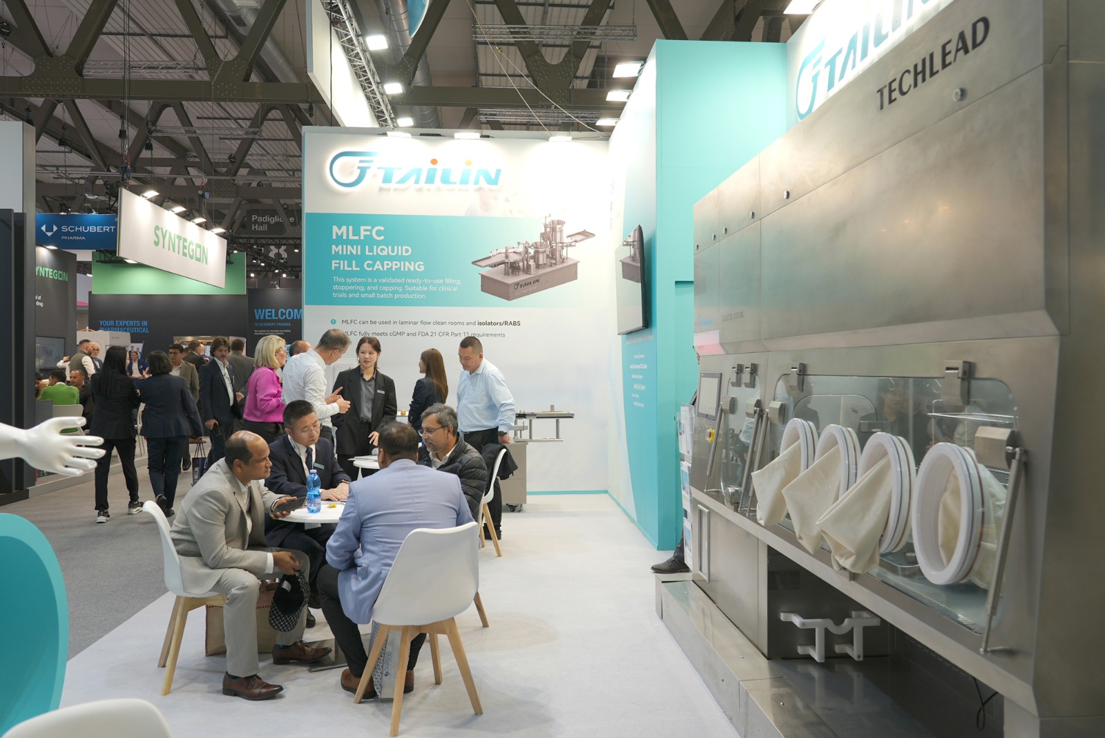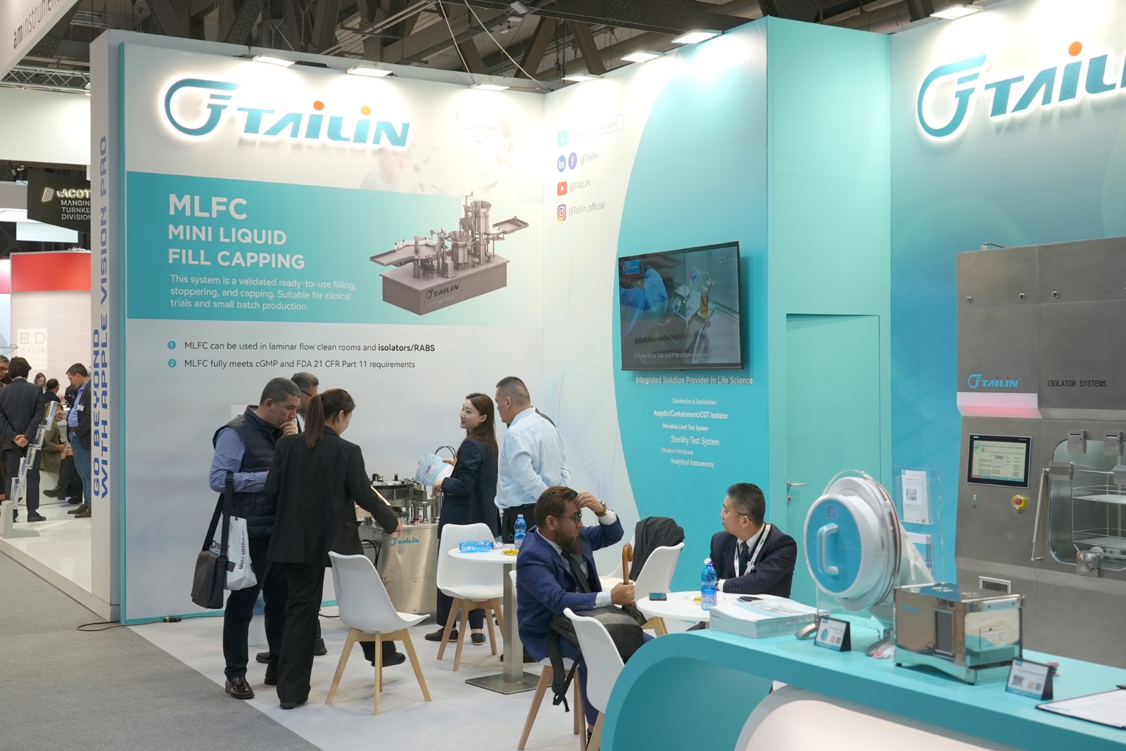 泰林生物作為生命科學(xué)領(lǐng)域“創(chuàng)新研發(fā)”和“新質(zhì)生產(chǎn)力”的代表,攜其旗艦產(chǎn)品無(wú)菌檢查隔離器、手套完整性測(cè)試儀、全自動(dòng)菌落計(jì)數(shù)系統(tǒng)、智能集菌儀、微生物檢驗(yàn)儀、濾芯測(cè)試儀等產(chǎn)品亮相,為行業(yè)呈現(xiàn)了一場(chǎng)數(shù)智科技場(chǎng)景成果盛宴。此次在海外展會(huì)首次璀璨亮相的微型液體灌裝機(jī),以其卓越的即用型灌裝加塞軋蓋系統(tǒng)ML FC,成為了全場(chǎng)矚目的焦點(diǎn)。MLFC極致縮小尺寸,以適合隔離器化趨勢(shì),滿足客戶在C級(jí)背景環(huán)境進(jìn)行無(wú)菌灌裝的需求。泰林生物依托數(shù)智科技,創(chuàng)新運(yùn)用自動(dòng)化、AI等新興技術(shù),深入挖掘用戶需求,打造出全場(chǎng)景全流程自動(dòng)化、數(shù)智化解決方案,滿足生命科學(xué)與高端裝備高質(zhì)量發(fā)展要求。