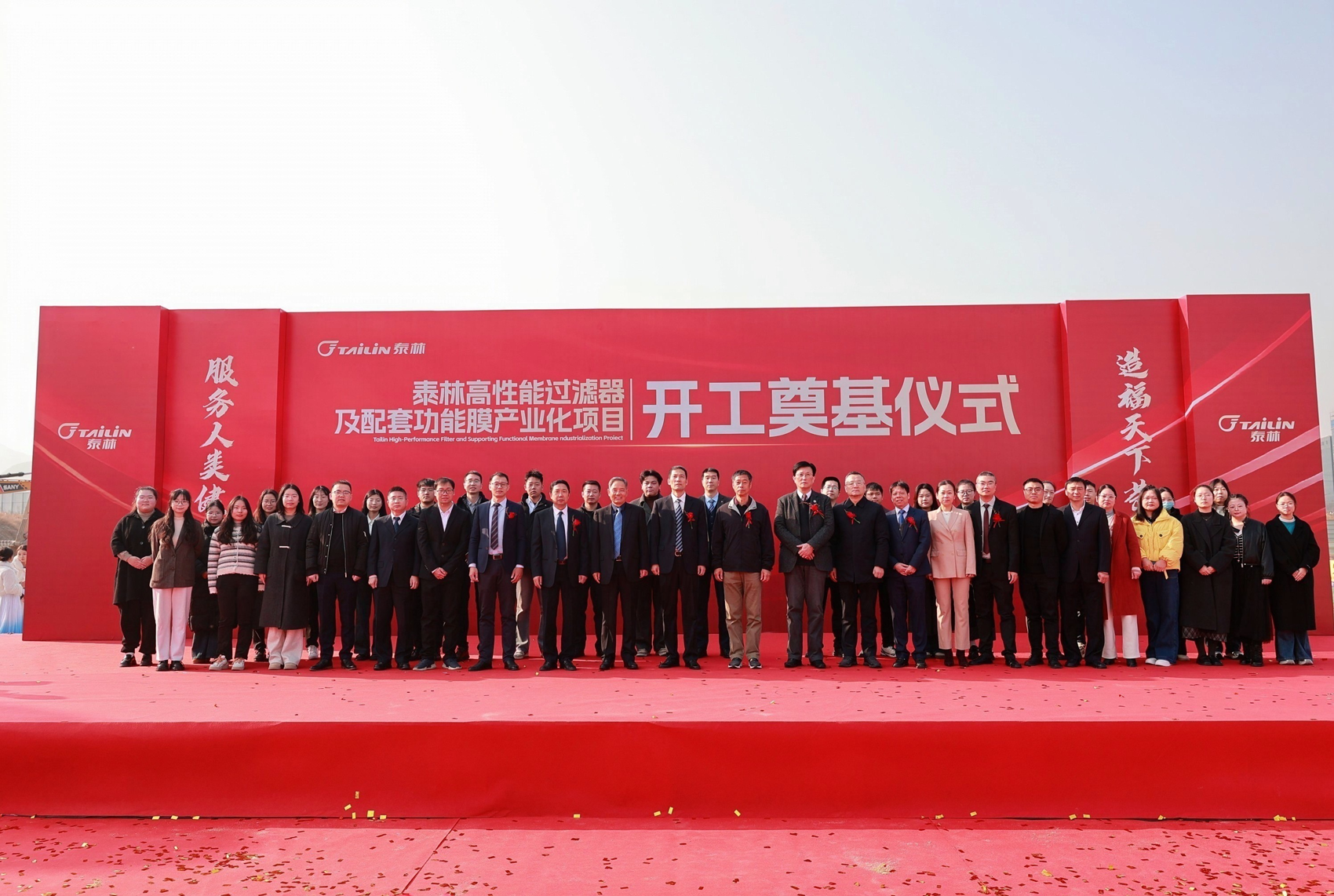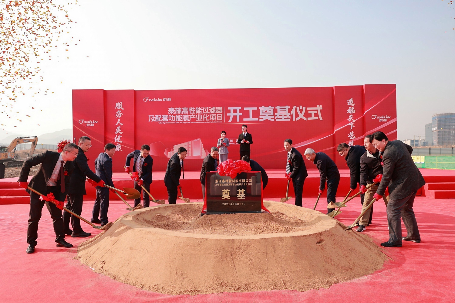 2025年12月17日上午,浙江泰林新材料有限公司高性能過濾器及配套功能膜產業化項目開工奠基儀式隆重舉行。中共杭州市富陽區委常委、杭州富春灣新城管委會主任孫偉,杭州市富陽區靈橋鎮黨委書記章繪,浙江省新材料產業協會理事長、浙江大學教授、浙江省特級專家楊輝,泰林生物董事長、總裁葉大林,泰林生物副總裁、泰林新材料總經理沈志林,泰林生物副總裁、泰林醫學工程總經理夏信群,泰林生物獨立董事董明、倪崖、厲國威,項目設計單位、總包單位、監理單位代表,泰林生物及旗下子公司管理團隊均蒞臨現場,共同見證了這一重要時刻!